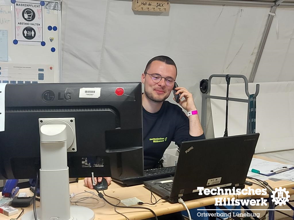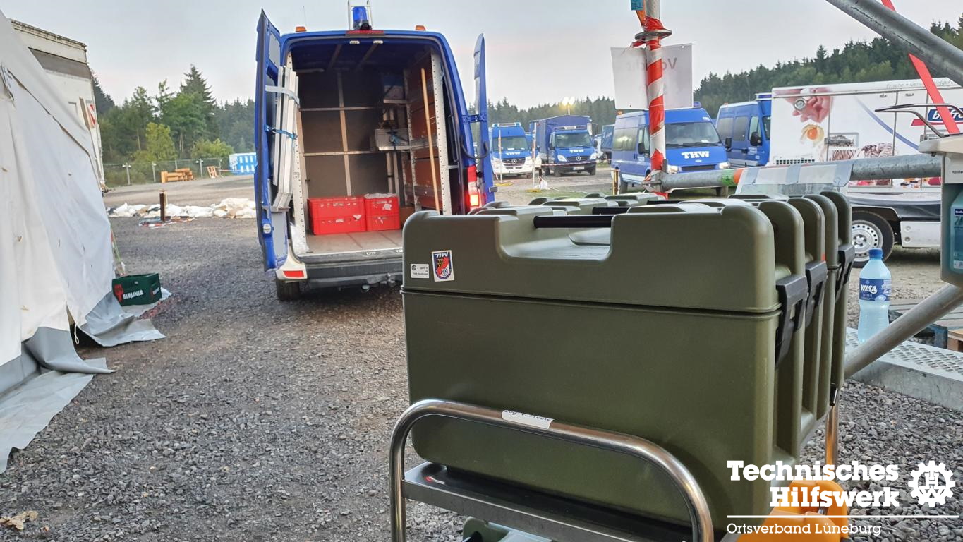 Der zweite Einsatzauftrag drehte sich um die Unterstützung der Stelle Verpflegung. Kaum im Bereitstellungsraum angekommen, wurde unser Helfer der Fachgruppe Logistik Verpflegung, statt in der Essensausgabe, an ganz anderer Stelle eingesetzt. Kurzerhand wurde er zum Leiter der Führungsstelle Verpflegung berufen und war somit für die ganze Logistik der Verpflegungsstelle zuständig. Dies beinhaltete die Beschaffung von Lebensmitteln und Getränken für die über 500 eingesetzten Helferinnen und Helfer, die Einteilung des Küchenpersonals für die Früh- und Spätschicht und die Lagerlogistik innerhalb des Bereitstellungsraumes. Durch die genannten familiären Verhältnisse innerhalb des THWs, organisierte er kurzerhand für den Geburtstag unseres Beauftragten für Öffentlichkeitsarbeit einen gedeckten Tisch mit „Tabaluga Geschirr“ und eine leckere Torte, die am Abend genüsslich in kleiner Runde verspeist wurde. Nichts ist unmöglich beim THW. Selbst im Einsatz nicht!