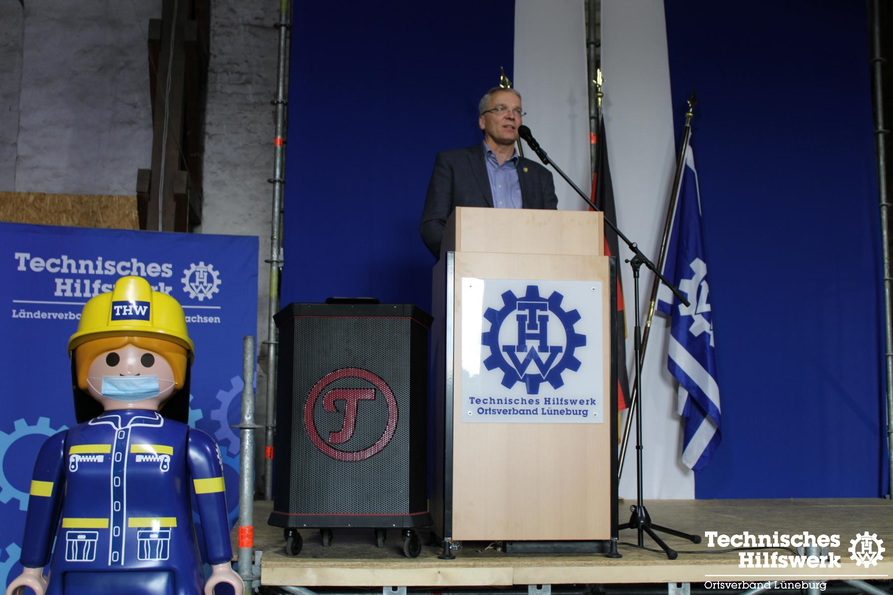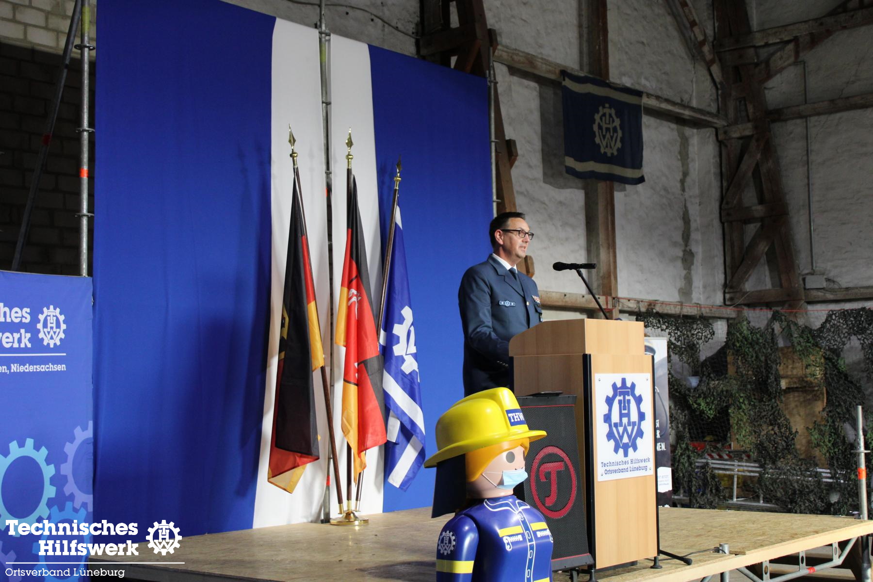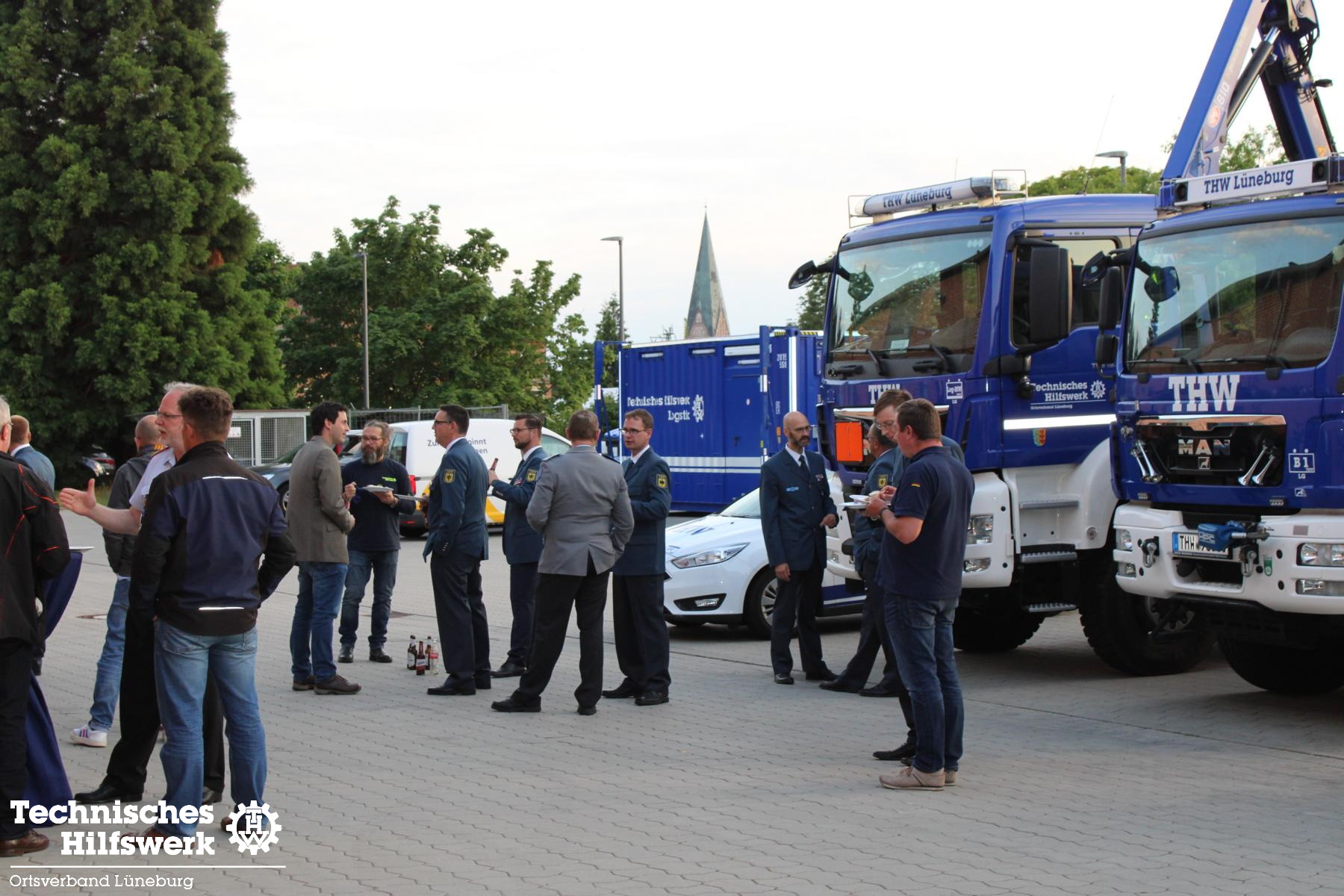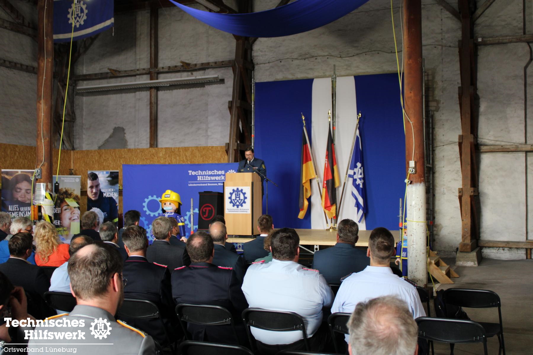 So konnte der Ortsbeauftragte Ingo Perkun am Fr., 10.6. um kurz nach 19.00 Uhr ca. 70 Gäste und 50 THW-Helfer*innen begrüßen, darunter auch Landesverbands-Referatsleiter Nils Grote und Landessprecher Thomas Kolodzi, sowie MdB Dr. Julia Verlinden und Abgeordnete aus Kreistag und Stadtrat. Landrat Jens Böther hielt ein Grußwort ebenso wie Bürgermeisterin Jule Grunau in Vertretung von OB Kalisch. Beide betonten die Wichtigkeit eins guten und zuverlässigen Bevölkerungsschutzes in Krisenzeiten, wie wir sie seit einigen Jahren erleben.