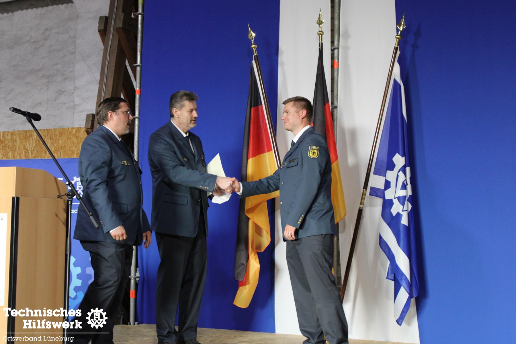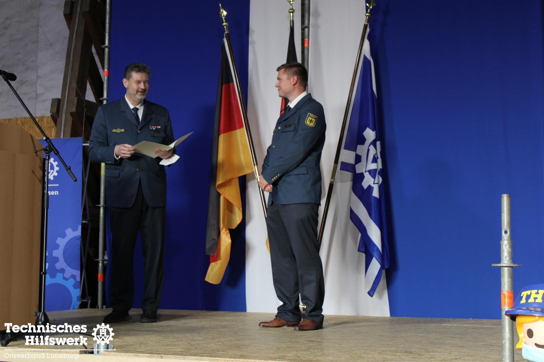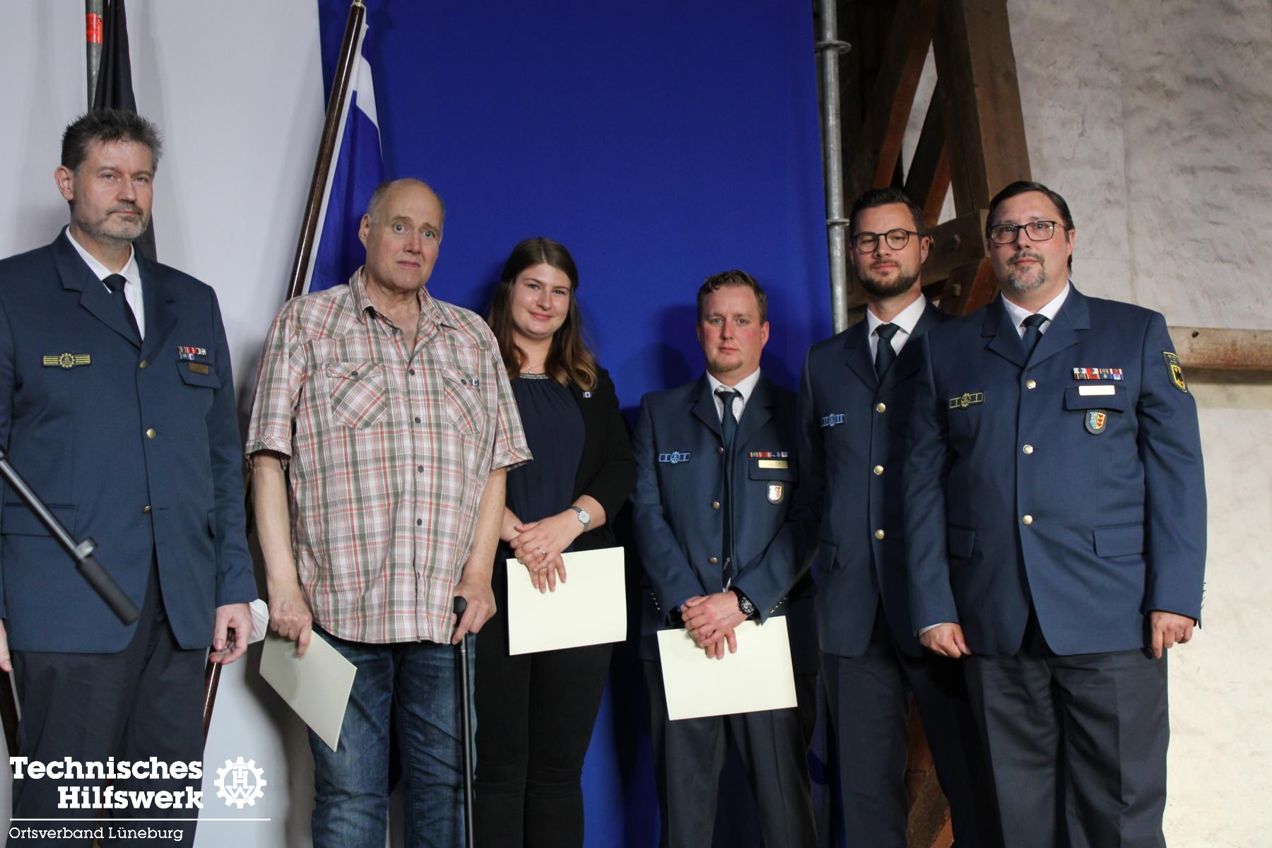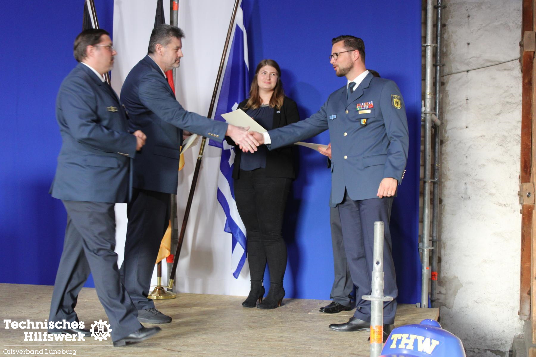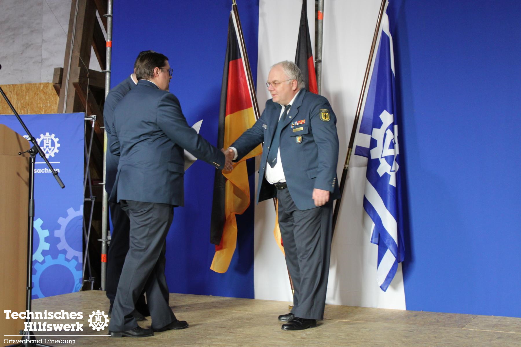 Zum Schluss folgte der formelle Teil. Hannes Beyer wurde zum neuen Stellvertretenden Ortsbeauftragten berufen, Godeke Klinge entsprechend abberufen. Godeke nimmt in Zukunft die Funktion eines Fachberaters THW auf der kommunalen und der Landesebene ein. Geehrt für langjährige Mitarbeit im THW wurden Jessica C. (10), Jan Schmidt (25), Ron Wülpern (30) und Michael Habig (40 Jahre). Godeke Klinge erhielt vom Landesverband, vertreten durch Referatsleiter Nils Grote, das THW-Ehrenzeichen in Bronze überreicht.