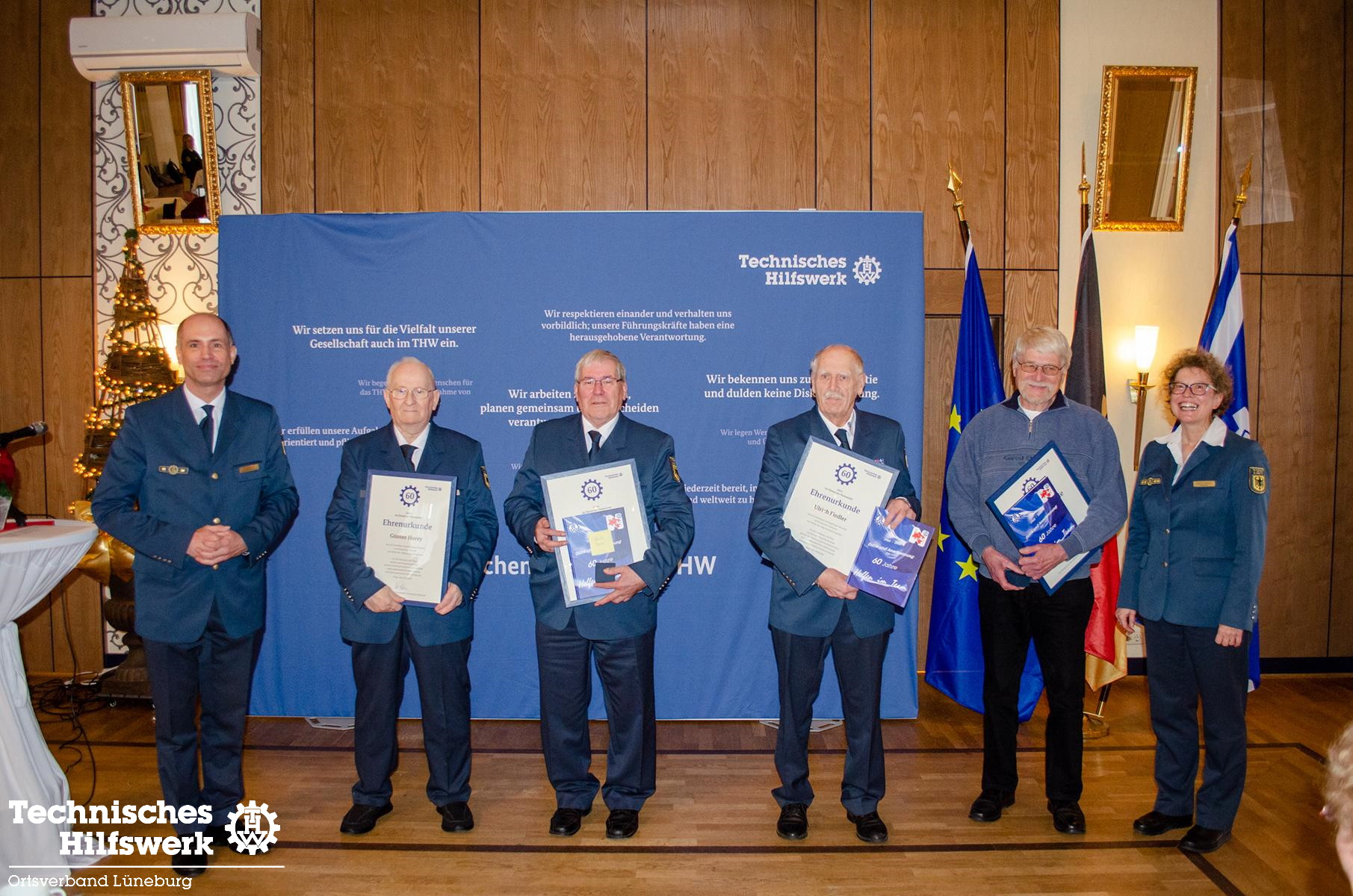 Neben Günter Horey (2. von links) erhielen weitere Jubilare ihre Ehrungen aus der Hand von Sabine Lackner, Vizepräsidentin der Bundesanstalt Technisches Hilfswerk, und dem THW-Landesbeauftragten für Bremen, Niedersachsen, Manuel Almanzor.