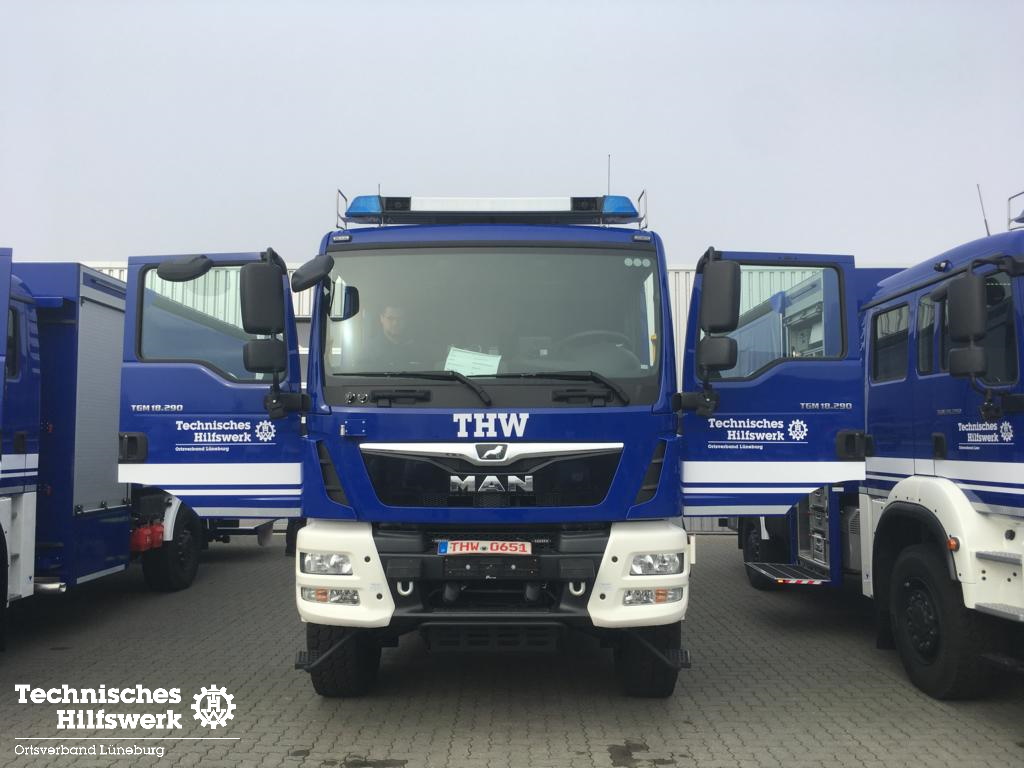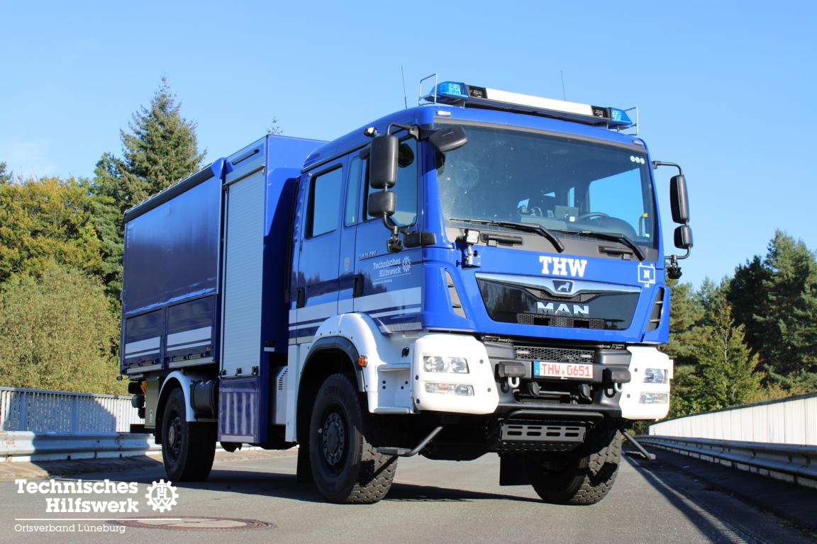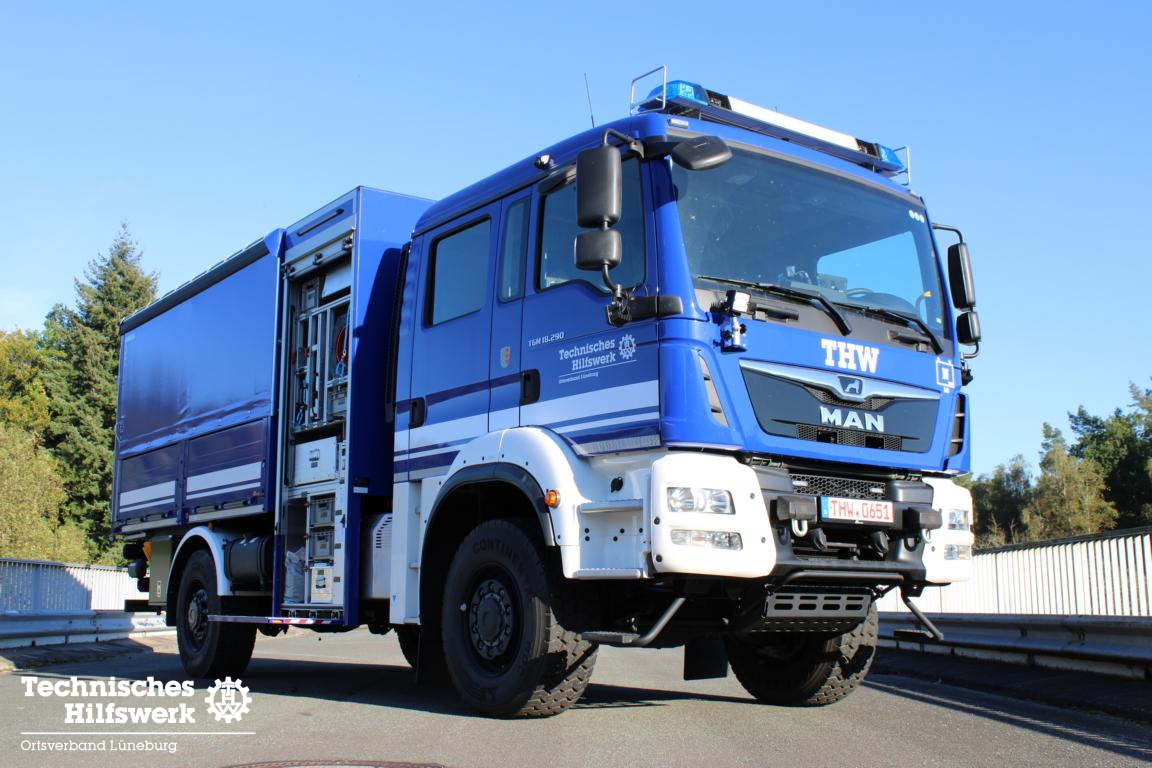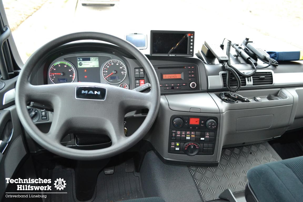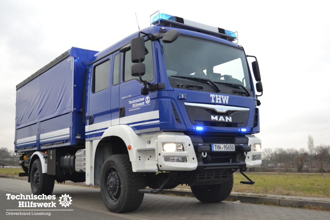Im Februar 2021 konnten wir einen neuen gebrauchten Mannschaftslastwagen 4 (MLW 4) aus dem Ortsverband Buxtehude übernehmen. Nachdem der Ortsverband einen neuen LKW Ladebordwand für die neue dislozierte Fachgruppe Elektroversorgung erhielt, wird der MLW 4 ab sofort in der Fachgruppe Logistik Materialwirtschaft als Transport- und Zugfahrzeug eingesetzt. Das neue Einsatzfahrzeug wurde auf Basis eines MAN TGM 13.250 4×4 BB Fahrgestells mit Gruppenkabine von der Firma Freytag aus Elze im Jahr 2016 gebaut, in dem bis zu sieben Helferinnen und Helfer zu Einsätzen transportiert werden können. Angetrieben von einem 250 PS (184 kW) starken Dieselmotor mit einem vollautomatisierten 12-Gang-Schaltgetriebe, erfüllt er die neueste Abgasnorm EURO 6. Dank permanentem Allradantrieb und diversen Antriebssperren meistert das Fahrzeuge auch Fahrten in unwegsamem Gelände sowie Wasser-Durchfahrten bis zu einer maximalen Tiefe von 600 mm. TETRA-Digitalfunk sowie 4 m Funk, Standheizung, Rückfahrkamera, LED-Blaulichtbalken sowie LED-Heck- und Frontblitzer, LED-Arbeitsscheinwerfer und ein Tempomat runden das Gesamtpaket ab.