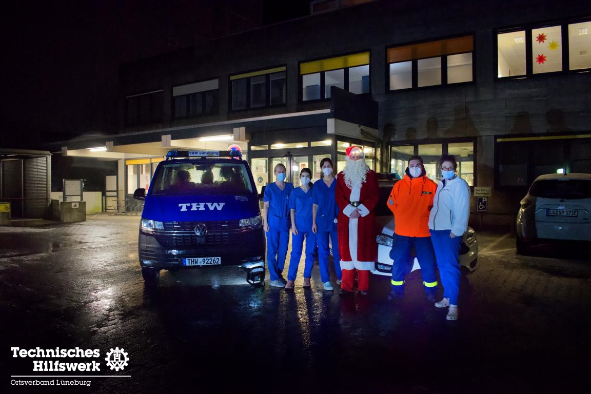 Die Aktion wurde mit der Leitung des Lüneburger Klinikums abgesprochen. Alle beteiligten Personen sind geimpft, geboostert und wurden vorher getestet. Ebenso trugen alle beteiligten Helferinnen und Helfer des Ortsverbandes eine FFP-2 Maske.