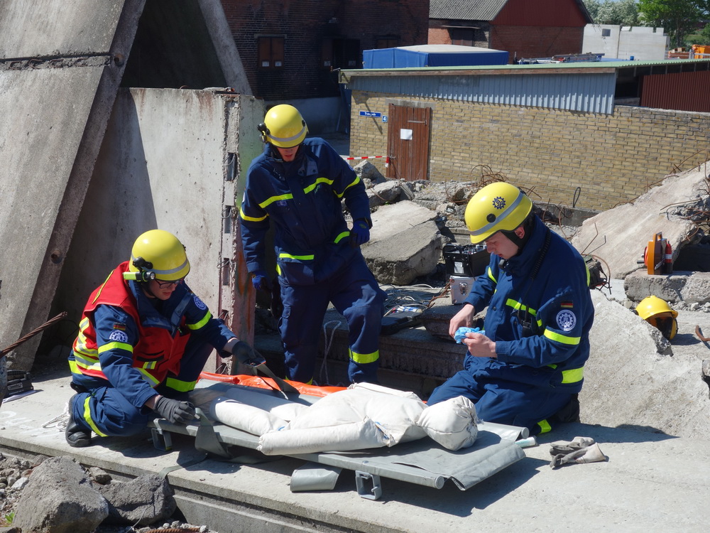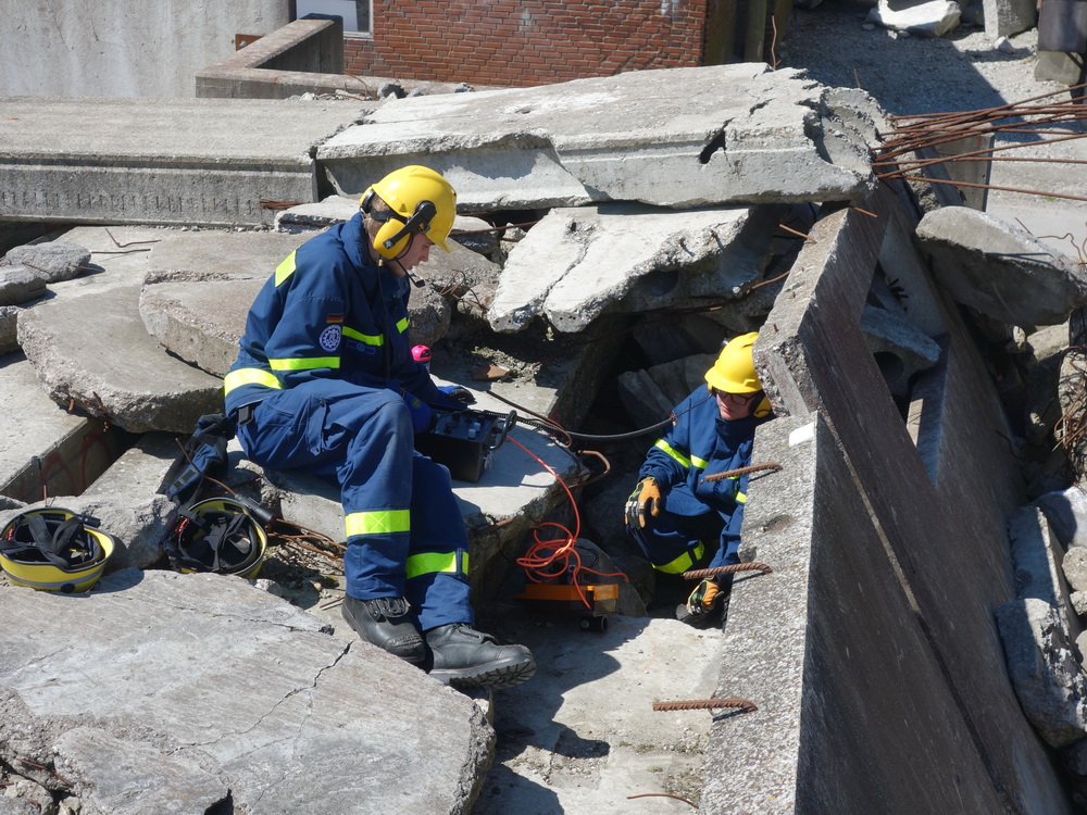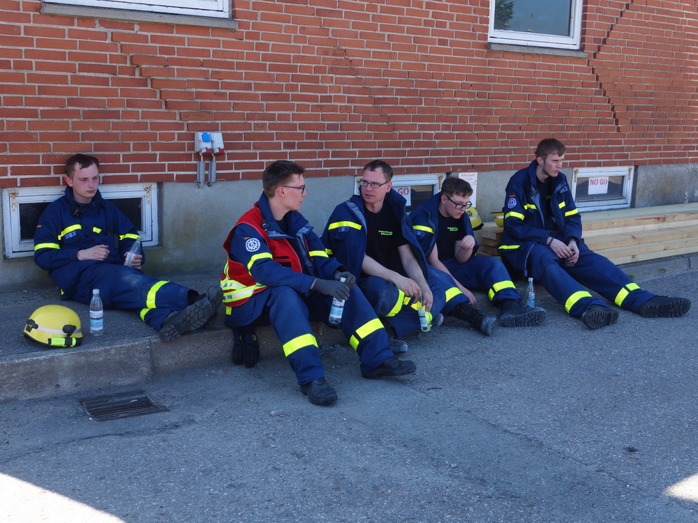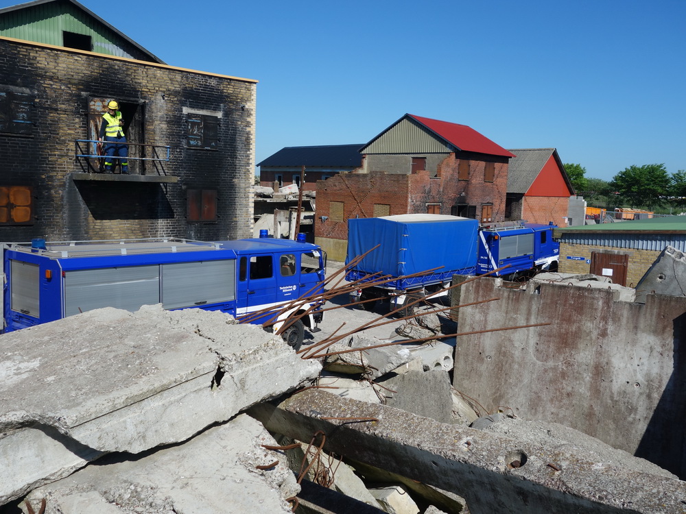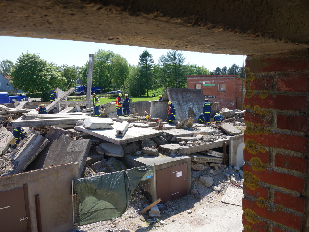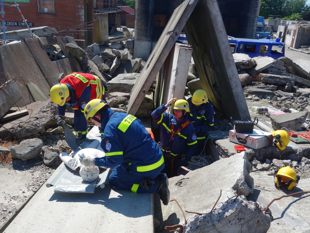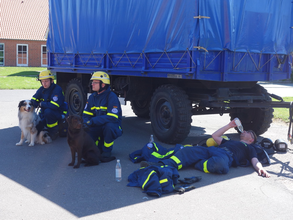 Bislang wußten sie gerade einmal, wo ihre technischen Ortungsgeräte im Mannschaftslastwagen verlastet sind und wie diese an- und ausgeschaltet werden, nun ging die Truppe um Gruppenführer Marvin Bahr gleich in die Vollen. Einen besseren Einstieg in die Thematik, als zwei Tage lang Überlebende in einem Trümmermeer unter der sengenden Sonne Süd-Dänemarks zu suchen und zu retten, kann man sich kaum vorstellen. Gemeinsam mit den Helferinnen und Helfern der Fachgruppe Biologische Ortung aus Gera, die, wie der Name schon verrät, vor allem auf speziell trainierte Hundenasen setzen, durchkämmten sie ehrgeizig ihre beiden Einsatzabschnitte. Und sie gingen stündlich besser, sicherer und routinierter ans Werk, wuchsen zusehends mit ihren Aufgaben und lernten schnell, ihre technischen Geräte sinnvoll zur Menschenrettung einzusetzen. Speziell am zweiten Tag der Übung wurden sie gefordert, als unter der Trümmerfläche eines großen Betonbaus in Atleborgs Neustadt mehrere teils schwerstverletzte Personen vermutet wurden. Nachdem die Mondlandschaft von den Hundeteams aus Gera erfolgreich abgesucht worden war, wußten die Helfer, wo die Rettungshunde in tieferen Lagen Explosionsopfer erschnüffelten. Die fünf Lüneburger starteten daraufhin einen regelrechten Lauschangriff durch die verschachtelt geschichteten Trümmer in die Tiefe, um den Grund für das Gebell präziser verorten und Sprechkontakt mit Überlebenden aufnehmen zu können. Zur Hand ging den beiden Ortungsgruppen in diesem Einsatzabschnitt die Zweite Bergungsgruppe aus Kiel, ein Hamburger Zugtrupp führte die drei Gruppen.