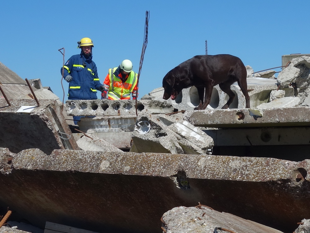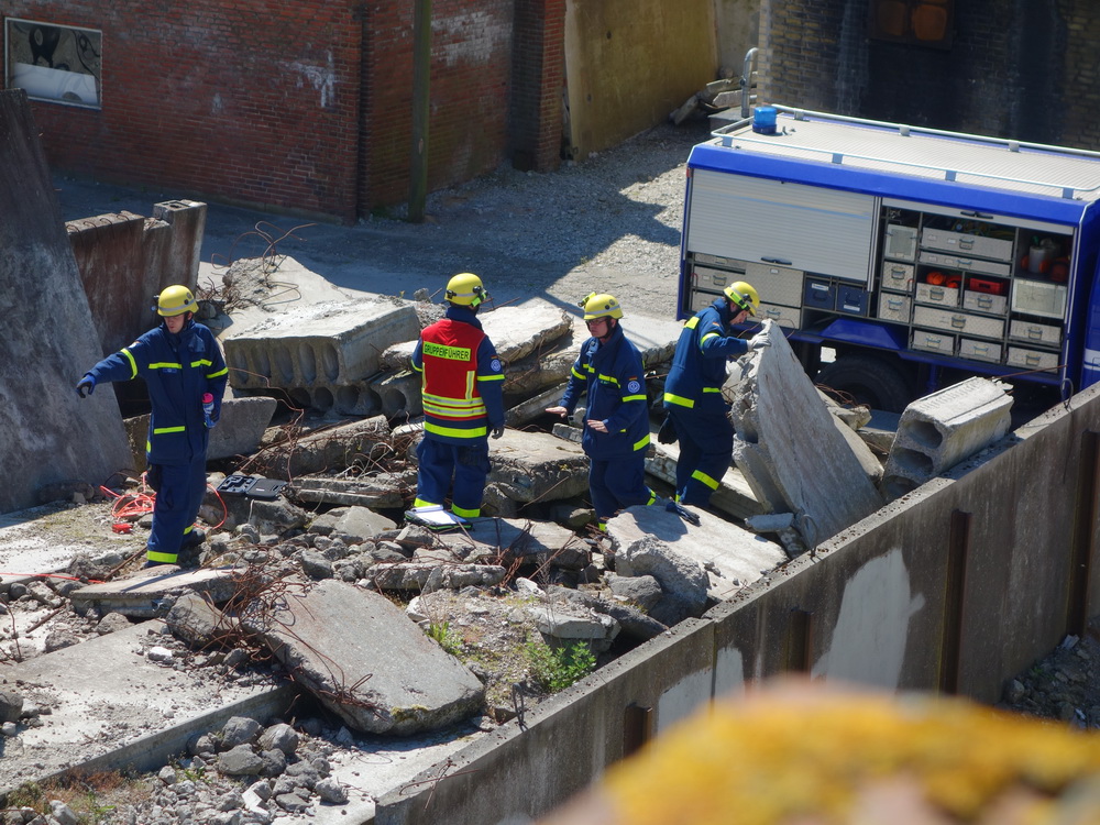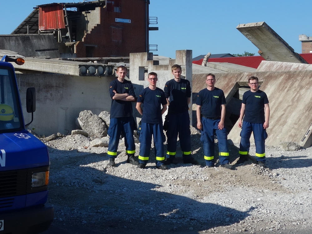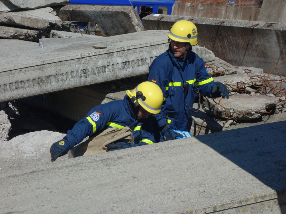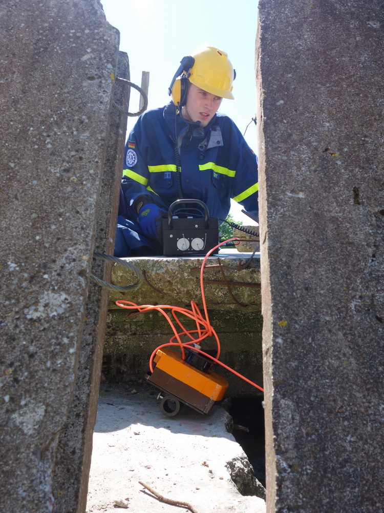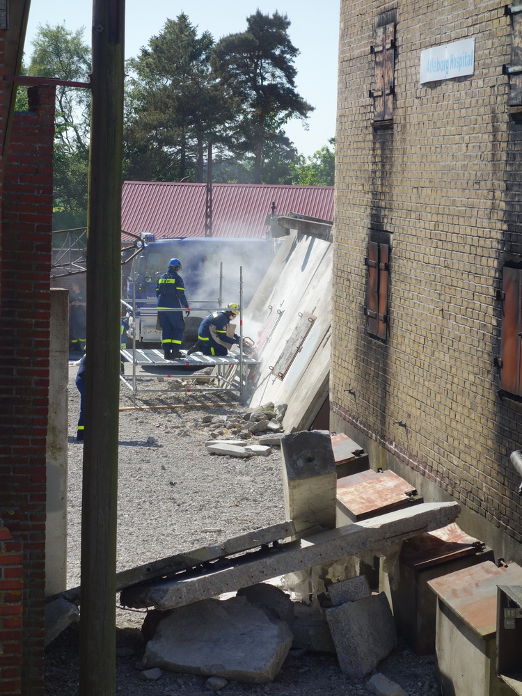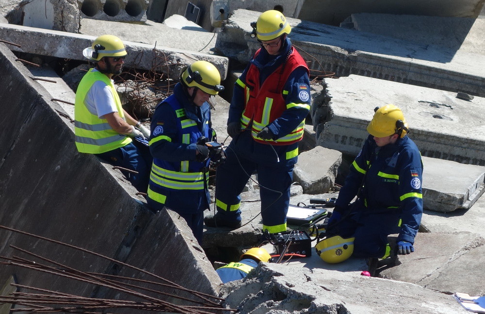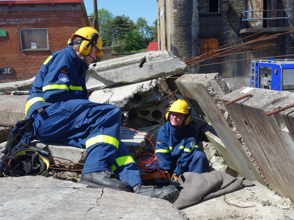 Bislang wußten sie gerade einmal, wo ihre technischen Ortungsgeräte im Mannschaftslastwagen verlastet sind und wie diese an- und ausgeschaltet werden, nun ging die Truppe um Gruppenführer Marvin Bahr gleich in die Vollen. Einen besseren Einstieg in die Thematik, als zwei Tage lang Überlebende in einem Trümmermeer unter der sengenden Sonne Süd-Dänemarks zu suchen und zu retten, kann man sich kaum vorstellen. Gemeinsam mit den Helferinnen und Helfern der Fachgruppe Biologische Ortung aus Gera, die, wie der Name schon verrät, vor allem auf speziell trainierte Hundenasen setzen, durchkämmten sie ehrgeizig ihre beiden Einsatzabschnitte. Und sie gingen stündlich besser, sicherer und routinierter ans Werk, wuchsen zusehends mit ihren Aufgaben und lernten schnell, ihre technischen Geräte sinnvoll zur Menschenrettung einzusetzen. Speziell am zweiten Tag der Übung wurden sie gefordert, als unter der Trümmerfläche eines großen Betonbaus in Atleborgs Neustadt mehrere teils schwerstverletzte Personen vermutet wurden. Nachdem die Mondlandschaft von den Hundeteams aus Gera erfolgreich abgesucht worden war, wußten die Helfer, wo die Rettungshunde in tieferen Lagen Explosionsopfer erschnüffelten. Die fünf Lüneburger starteten daraufhin einen regelrechten Lauschangriff durch die verschachtelt geschichteten Trümmer in die Tiefe, um den Grund für das Gebell präziser verorten und Sprechkontakt mit Überlebenden aufnehmen zu können. Zur Hand ging den beiden Ortungsgruppen in diesem Einsatzabschnitt die Zweite Bergungsgruppe aus Kiel, ein Hamburger Zugtrupp führte die drei Gruppen.