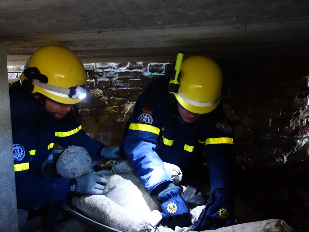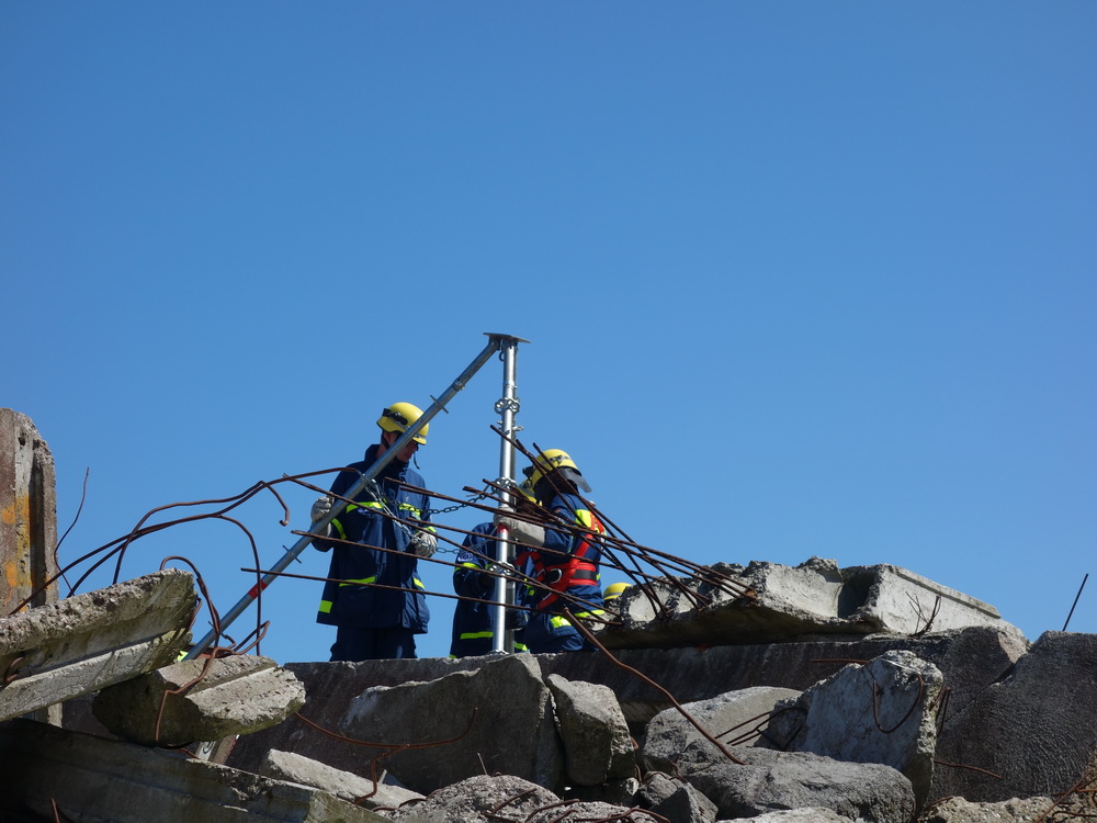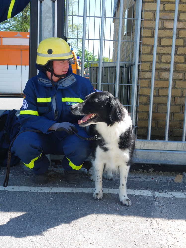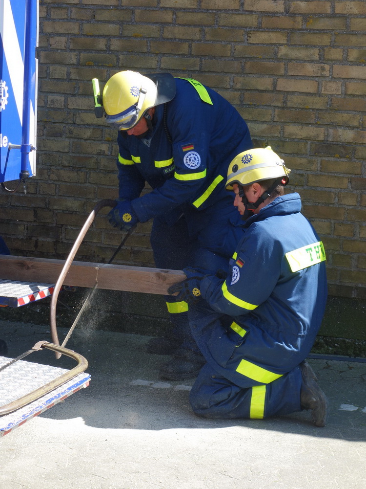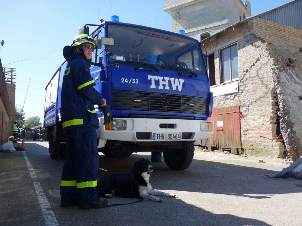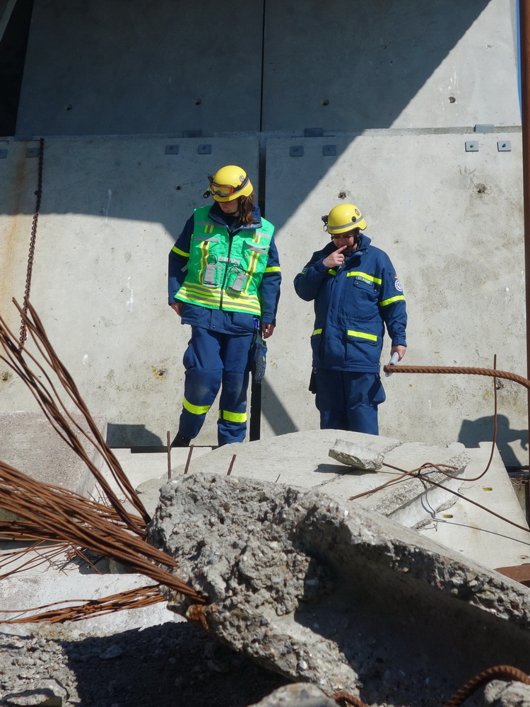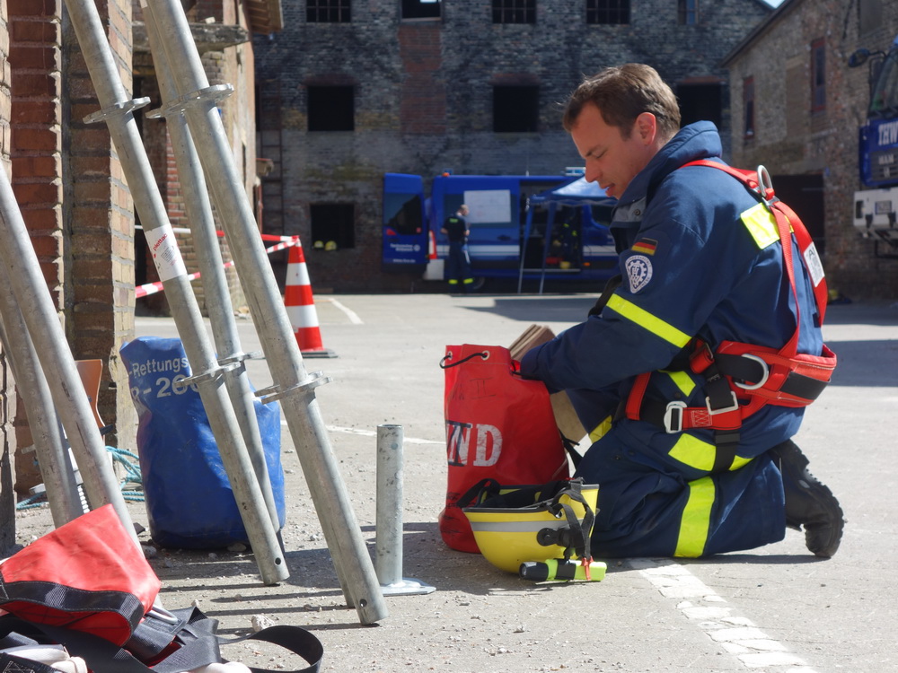 Bislang wußten sie gerade einmal, wo ihre technischen Ortungsgeräte im Mannschaftslastwagen verlastet sind und wie diese an- und ausgeschaltet werden, nun ging die Truppe um Gruppenführer Marvin Bahr gleich in die Vollen. Einen besseren Einstieg in die Thematik, als zwei Tage lang Überlebende in einem Trümmermeer unter der sengenden Sonne Süd-Dänemarks zu suchen und zu retten, kann man sich kaum vorstellen. Gemeinsam mit den Helferinnen und Helfern der Fachgruppe Biologische Ortung aus Gera, die, wie der Name schon verrät, vor allem auf speziell trainierte Hundenasen setzen, durchkämmten sie ehrgeizig ihre beiden Einsatzabschnitte. Und sie gingen stündlich besser, sicherer und routinierter ans Werk, wuchsen zusehends mit ihren Aufgaben und lernten schnell, ihre technischen Geräte sinnvoll zur Menschenrettung einzusetzen. Speziell am zweiten Tag der Übung wurden sie gefordert, als unter der Trümmerfläche eines großen Betonbaus in Atleborgs Neustadt mehrere teils schwerstverletzte Personen vermutet wurden. Nachdem die Mondlandschaft von den Hundeteams aus Gera erfolgreich abgesucht worden war, wußten die Helfer, wo die Rettungshunde in tieferen Lagen Explosionsopfer erschnüffelten. Die fünf Lüneburger starteten daraufhin einen regelrechten Lauschangriff durch die verschachtelt geschichteten Trümmer in die Tiefe, um den Grund für das Gebell präziser verorten und Sprechkontakt mit Überlebenden aufnehmen zu können. Zur Hand ging den beiden Ortungsgruppen in diesem Einsatzabschnitt die Zweite Bergungsgruppe aus Kiel, ein Hamburger Zugtrupp führte die drei Gruppen.