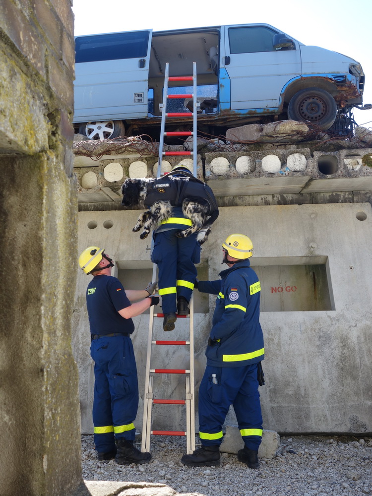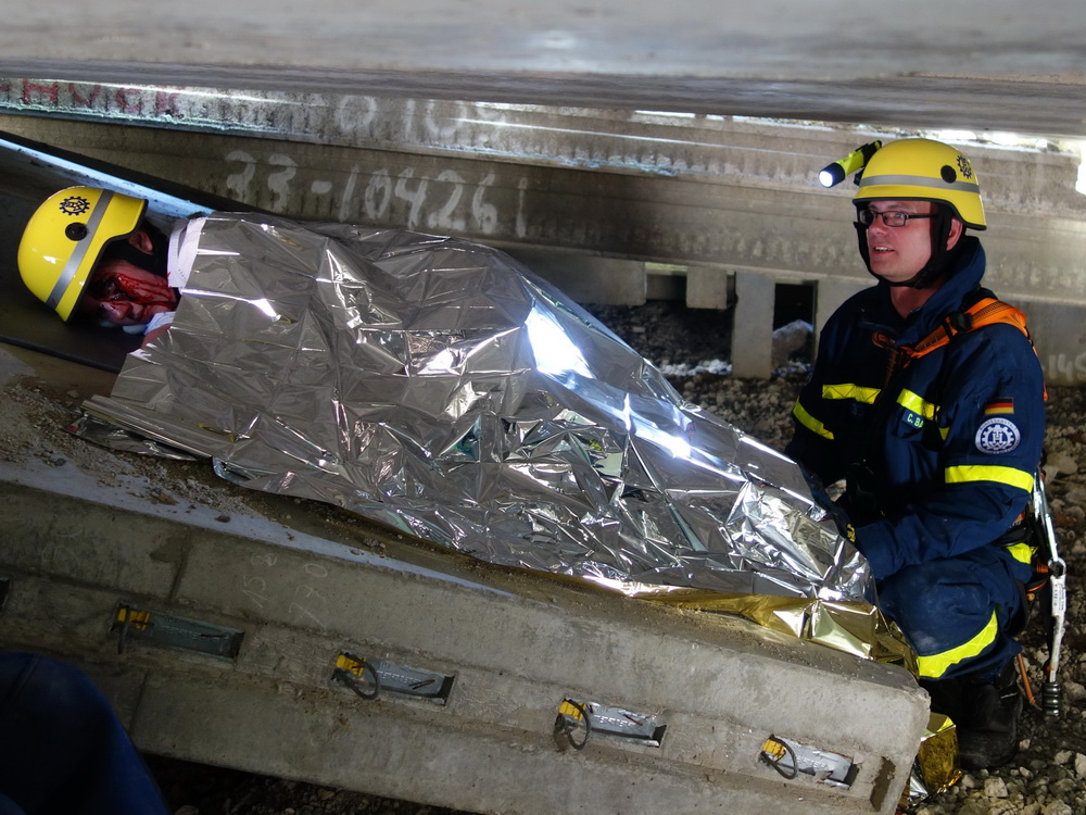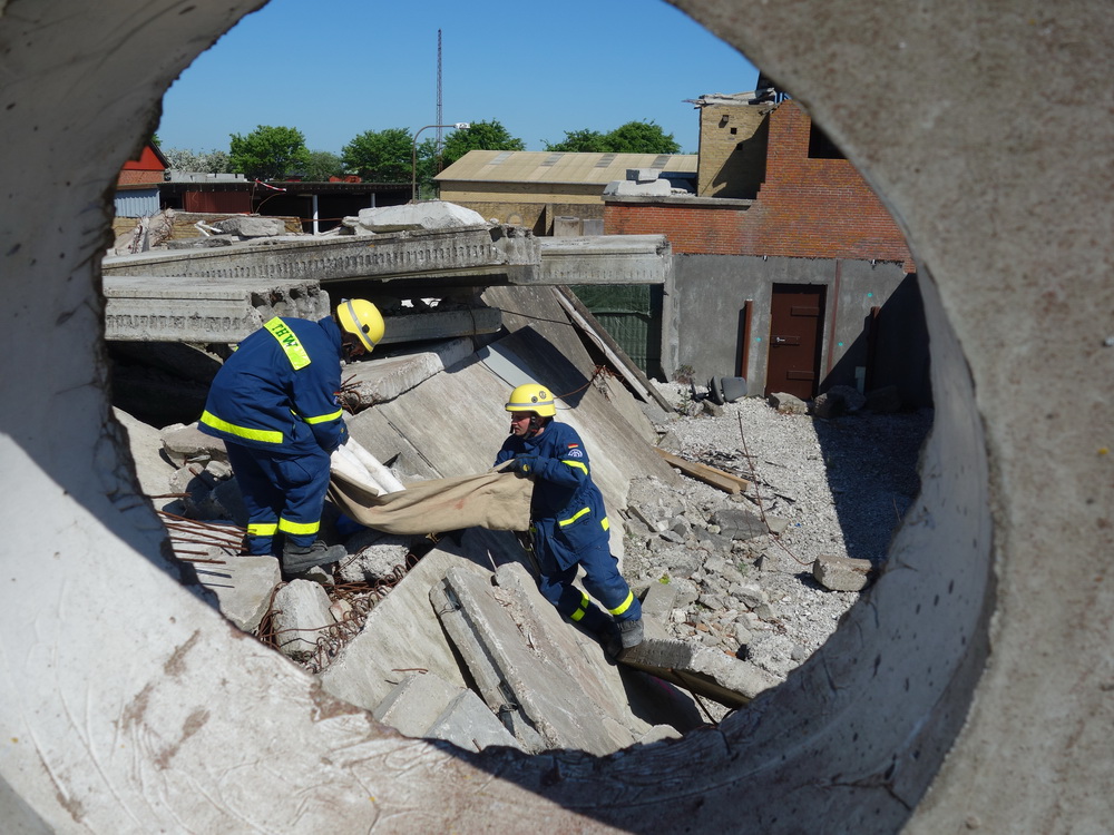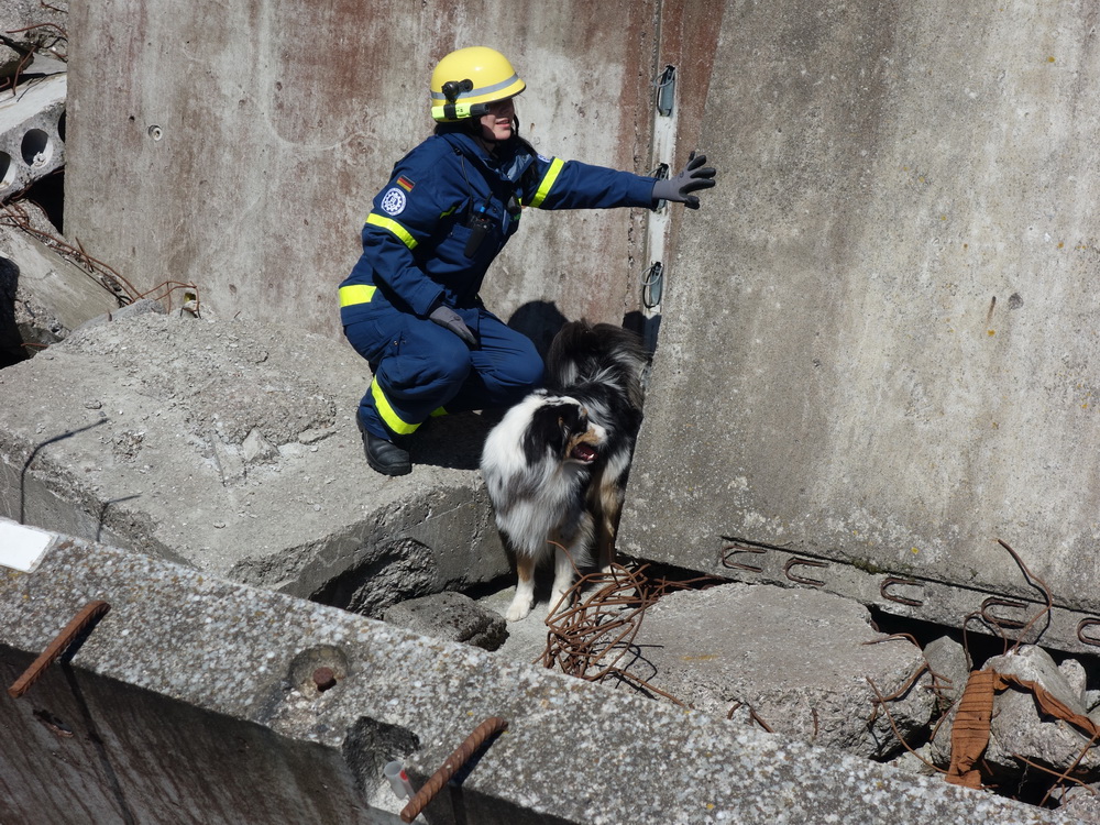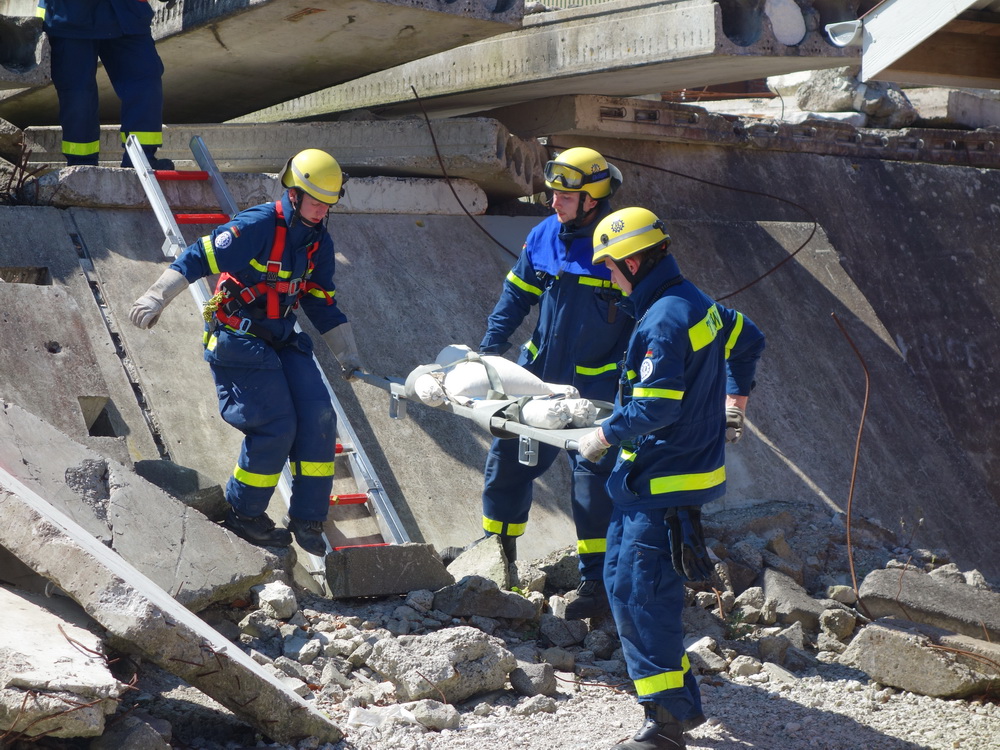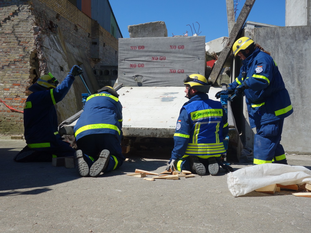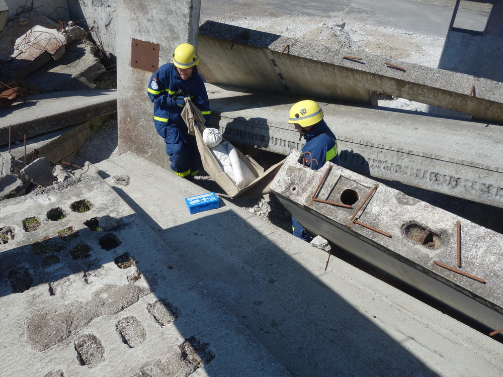 Bislang wußten sie gerade einmal, wo ihre technischen Ortungsgeräte im Mannschaftslastwagen verlastet sind und wie diese an- und ausgeschaltet werden, nun ging die Truppe um Gruppenführer Marvin Bahr gleich in die Vollen. Einen besseren Einstieg in die Thematik, als zwei Tage lang Überlebende in einem Trümmermeer unter der sengenden Sonne Süd-Dänemarks zu suchen und zu retten, kann man sich kaum vorstellen. Gemeinsam mit den Helferinnen und Helfern der Fachgruppe Biologische Ortung aus Gera, die, wie der Name schon verrät, vor allem auf speziell trainierte Hundenasen setzen, durchkämmten sie ehrgeizig ihre beiden Einsatzabschnitte. Und sie gingen stündlich besser, sicherer und routinierter ans Werk, wuchsen zusehends mit ihren Aufgaben und lernten schnell, ihre technischen Geräte sinnvoll zur Menschenrettung einzusetzen. Speziell am zweiten Tag der Übung wurden sie gefordert, als unter der Trümmerfläche eines großen Betonbaus in Atleborgs Neustadt mehrere teils schwerstverletzte Personen vermutet wurden. Nachdem die Mondlandschaft von den Hundeteams aus Gera erfolgreich abgesucht worden war, wußten die Helfer, wo die Rettungshunde in tieferen Lagen Explosionsopfer erschnüffelten. Die fünf Lüneburger starteten daraufhin einen regelrechten Lauschangriff durch die verschachtelt geschichteten Trümmer in die Tiefe, um den Grund für das Gebell präziser verorten und Sprechkontakt mit Überlebenden aufnehmen zu können. Zur Hand ging den beiden Ortungsgruppen in diesem Einsatzabschnitt die Zweite Bergungsgruppe aus Kiel, ein Hamburger Zugtrupp führte die drei Gruppen.